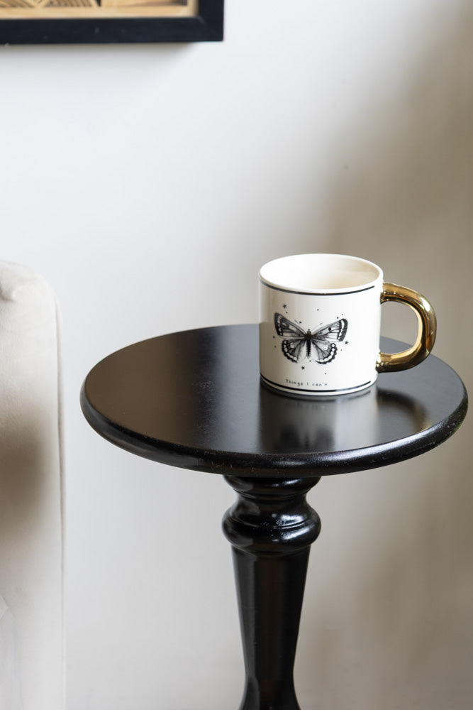 Bonjour l'élégance ! Découvrez la table d'appoint noire en bois tourné – la petite pièce sophistiquée dont votre intérieur rêvait. Avec sa gracieuse finition noire brillante, incurvée et tournée à la main, cette table d'appoint de salon dégage une énergie incomparable. Parfaitement petite et infiniment élégante, c'est la table d'appoint idéale pour poser votre café du matin, un cocktail original ou une bougie. Placez-la près de votre fauteuil préféré, ou même près de la salle de bain. Un brin vintage, un brin moderne et une touche de fantaisie.